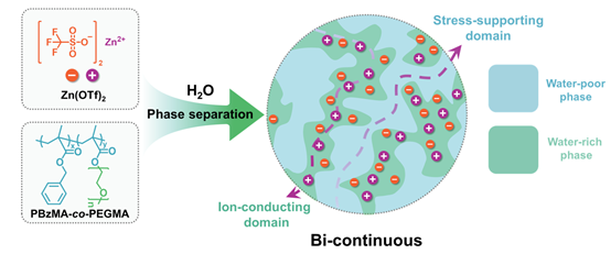 张彦峰教授、明小庆研究员团队聚焦于水凝胶电解质微观结构调控,通过水诱导微相分离策略构建了具有双连续相结构的微相分离水凝胶电解质。基于两亲性聚合物中单体亲疏水性差异,以水作为诱导因子使得亲疏水链段分别聚集,刚性的疏水链段承担载荷,极大提升力学性能(模量达134.6 MPa);柔性亲水链段运动为离子传输提供通路,使水凝胶具有可观的离子电导率(1.46 mS cm-1)。基于该电解质的对称电池能够循环1100 h以上,Zn||V2O5全电池表现出高容量(0.2 C下278 mAh·g-1)、优异倍率与长寿命循环(5.0 C下循环1000次后容量近100%保持)。